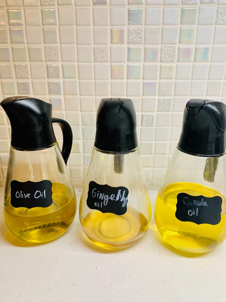 My mom had bought glass oil dispensers. We labeled them and put them in an order inside a pullout shelf.