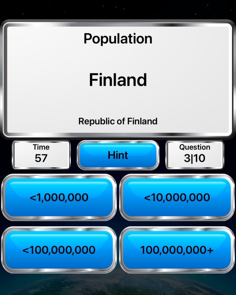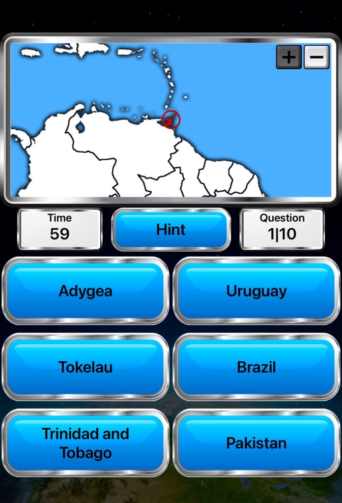 At the end of each geographical quiz you get some bonus questions and a chance to get a prize that can be good or bad and you get hints via these bonuses. The game is really fun and if you don’t know much about geography you will soon after you’ve finished with this game! It’s one of the most fun games in the world in my opinion. And it’s completely free! And if you would like learning about countries just use this game a lot.