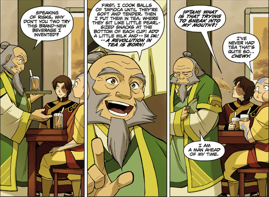 To think that the creators of Avatar made was put way back in time from the world right now, and Uncle Iroh made bubble tea! They even added that he thought he was “a man ahead of my time”. He truly was ahead of his time.