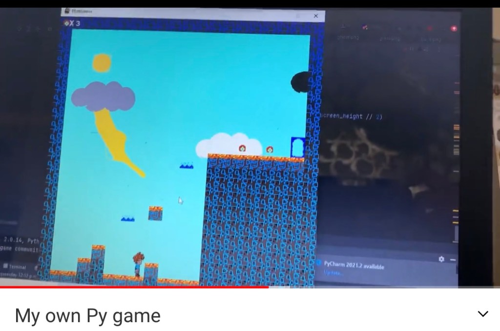 A while ago, I finished coding my very own game! I’m showing how the game and the code works in a video below. It all started when my mom signed me up for a camp known as the Steam Engine. It was made my 3 teachers who would teach me about the 3 different topics we had. The topics were under Art, Science, and Coding categories. We would start each time with art, then have a 15 min break, coding, another 15 min break, and end of with science. In the coding class, our teacher showed us Pycharm, a variant of python that could be used for coding as well. We all downloaded it and then our teacher started to teach us a bit about Pycharm and helped us code the game. It took almost 2 months, but finally, we finished the game. Now, we’re just changing the music, how the player looks, the looks of the blocks, the enemies, etc. It took a lot of effort, but it was worth it.