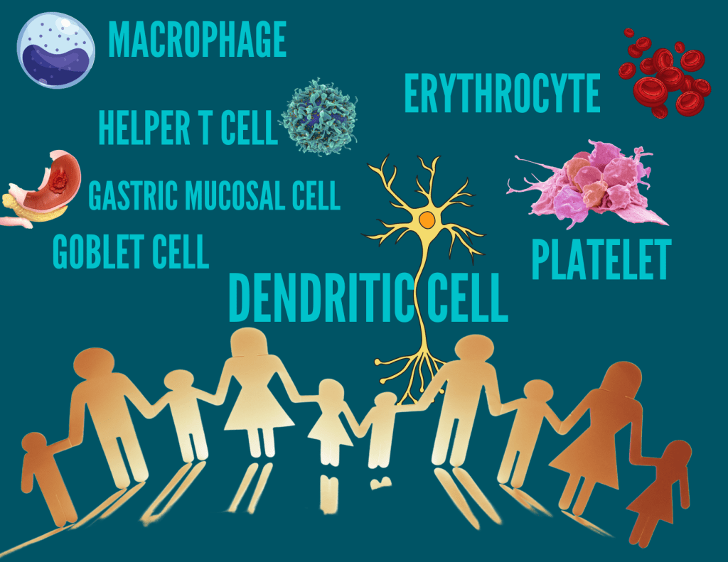 Grandpa: Intestinal epithelial cell. He would most likely be a intestinal epithelial cell because he’s always just cleaning up the kitchen, like how the intestinal epithelial cells take care of the intestines.