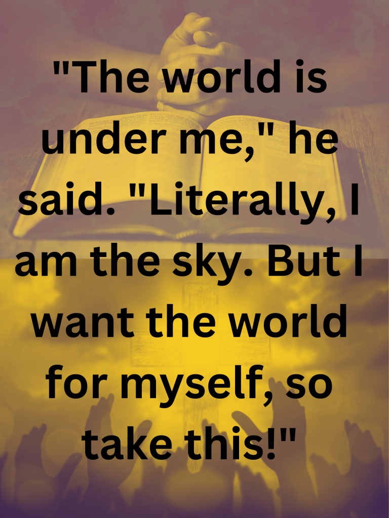 Aether struck Treterra with a massive gust of wind, and Treterra was hit against a mountain. To fight back, he created the god of rocks, Sarsen. Sarsen appeared and asked what was happening. Treterra explained, and then Sarsen saw Aether destroying the world. They launched hundreds of meteors at Aether, but Aether released a gust of wind, which had no effect and struck Aether. Aether was propelled into the sky and didn’t return. Then Sarsen struck the ground with his hand, and an enormous cavern opened up. Rocks fell from the sky and shattered the mountains. Then, Seraphine emerged from the cave and threw Sarsen back inside, and Seraphine continued to destroy the world. Talise defeated her, and they continued like that for eternity.