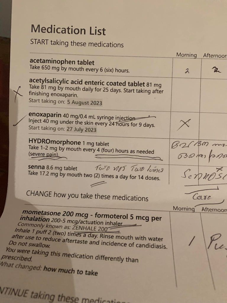 In terms of medications, he had to take HydroMorphone for pain relief at four-hour intervals. Additionally, he required daily blood thinner injections to prevent blood clots, which can be a risk after surgery.