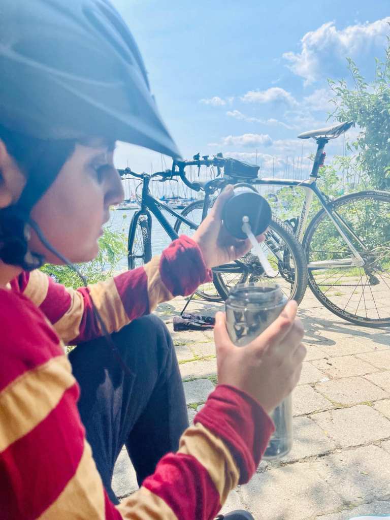 Even though we didn’t cover a long distance on our bikes due to my dad having a meeting later, we still managed to enjoy the trip. In total, we biked around 5 km. The weather was quite hot, so I had to wear a full sleeve shirt as my mom insisted I had to, as so to protect me from sun damage.