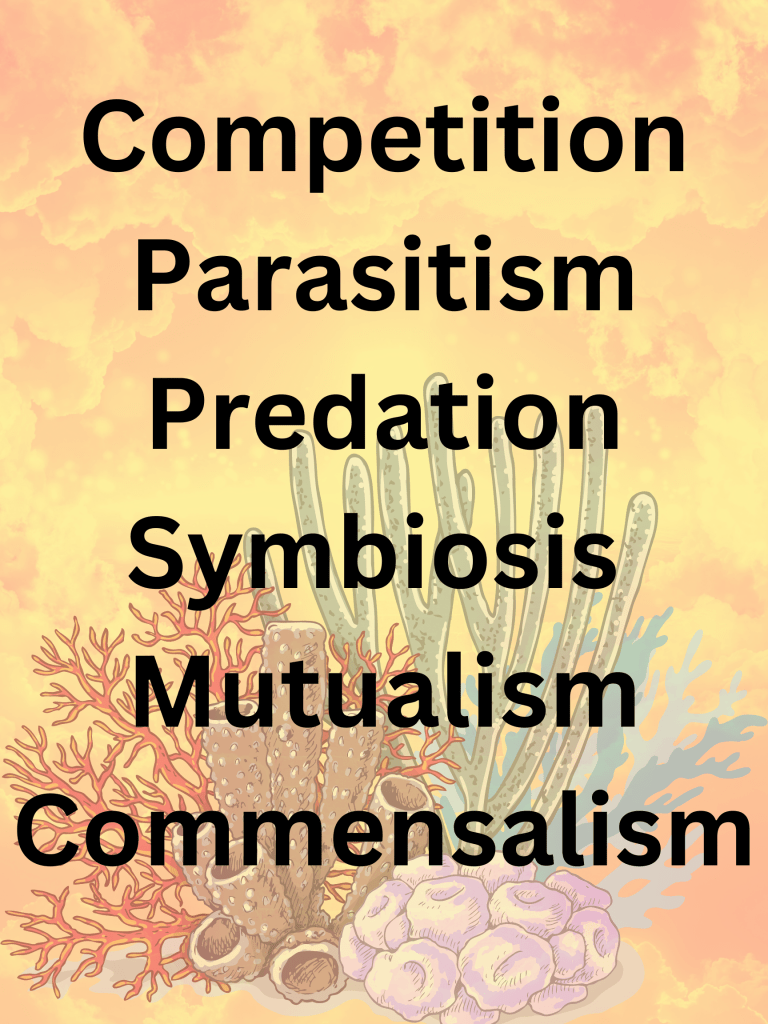 Hello everyone! Today, I’m going to be talking about the six intraspecific and interspecific relationships in nature. The six intraspecific and interspecific relationships are competition, predation, parasitism, symbiosis, mutualism, and commensalism.