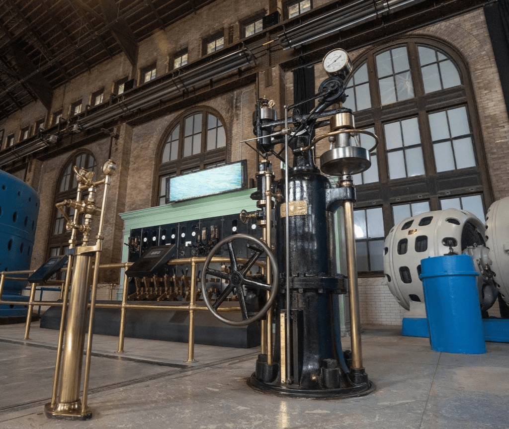Even though the original boilers were dismantled during World War II for parts used in war machinery, the museum has preserved the pumps. Upstairs, we saw two of the original steam pumps. They’ve installed an electric motor to show how the pumps used to work, but at just 1/15th of their original speed for safety and demonstration purposes.